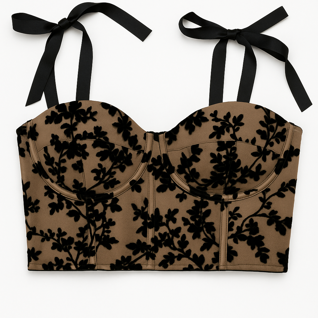 El Corset Éclipse es una pieza de alto impacto visual que une romanticismo y elegancia con su bordado floral aterciopelado. Su estructura realza la figura, mientras que los tirantes con lazos permiten un ajuste delicado. Perfecto para eventos especiales, looks de noche o para sentirte poderosa en tu propio estilo.