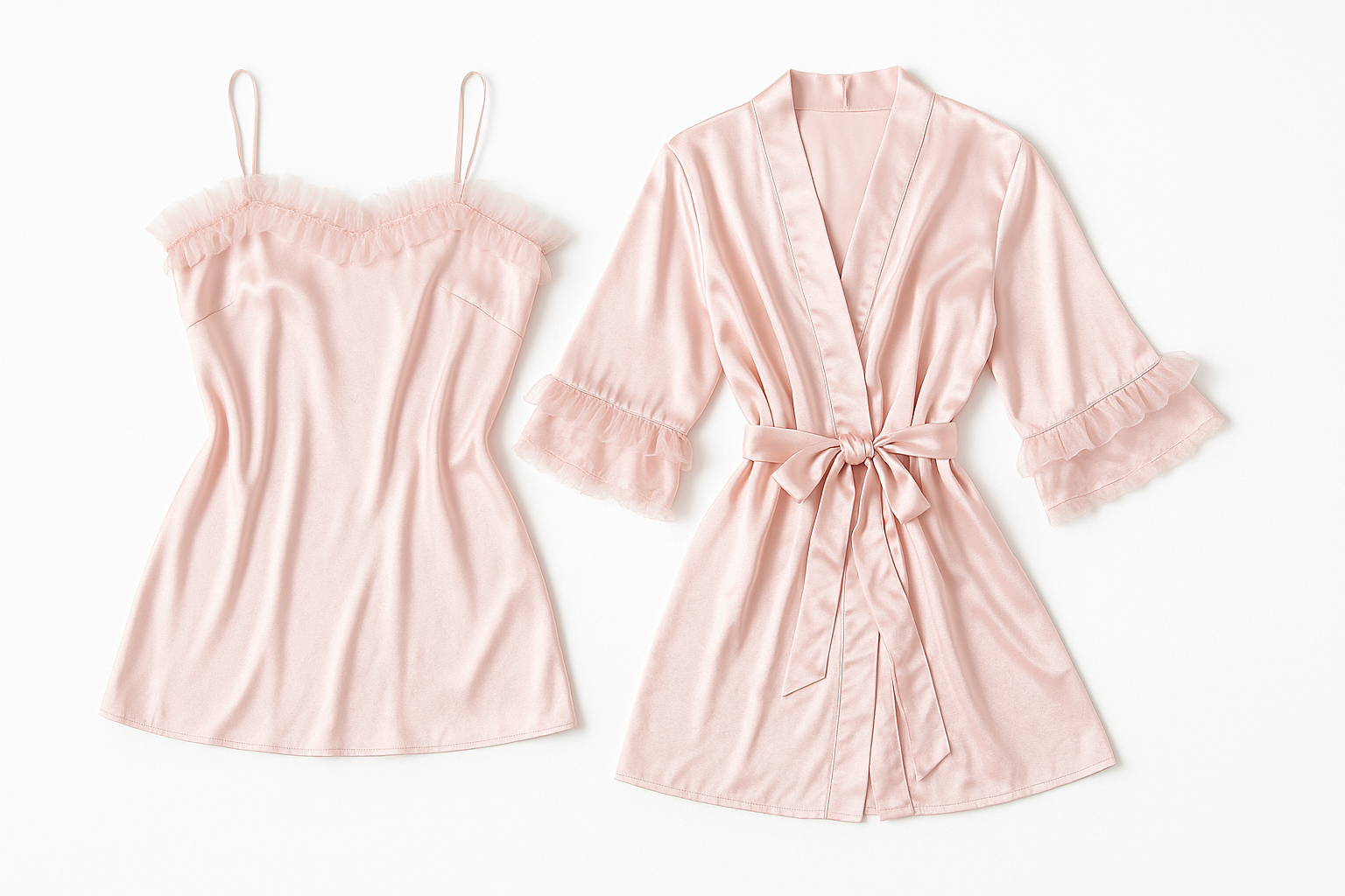 Descubre la elegancia suave de nuestro conjunto Dulce Encanto, diseñado para envolver tu rutina nocturna con feminidad y confort. Este set de dos piezas incluye un camisón satinado con tirantes finos y delicado detalle de tul fruncido en el escote, acompañado de una bata corta a juego con mangas amplias adornadas con el mismo toque de tul en los puños. Su tono rosa pastel y su caída sedosa convierten este conjunto en la elección ideal para sentirte hermosa y mimada, ya sea en una noche especial o como parte de tu ritual diario de autocuidado.