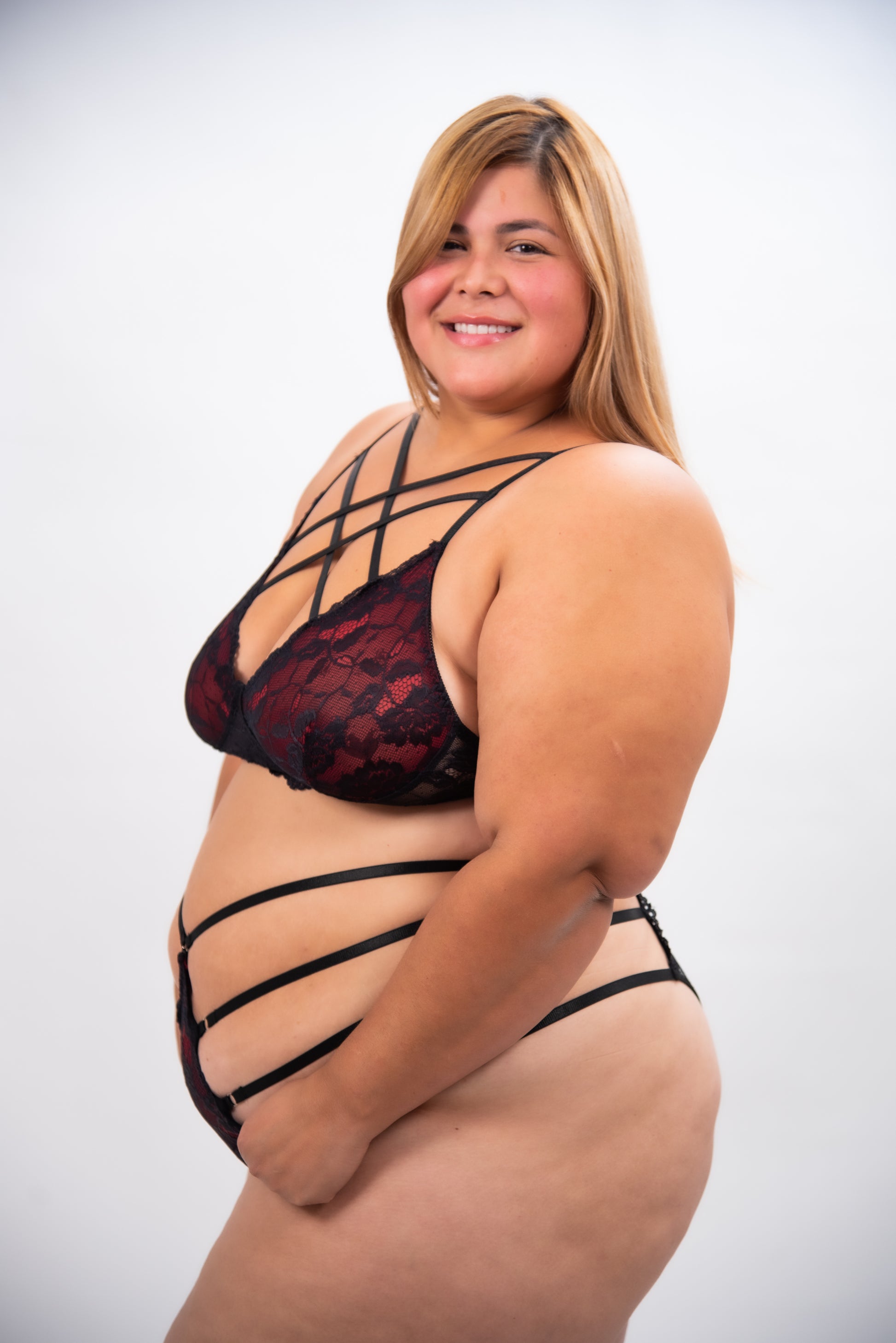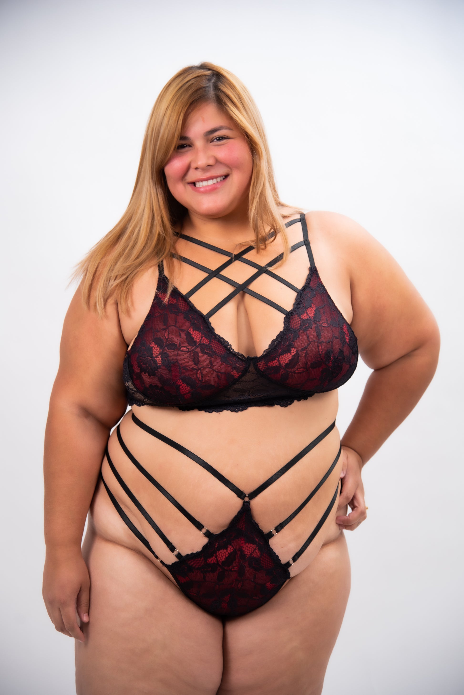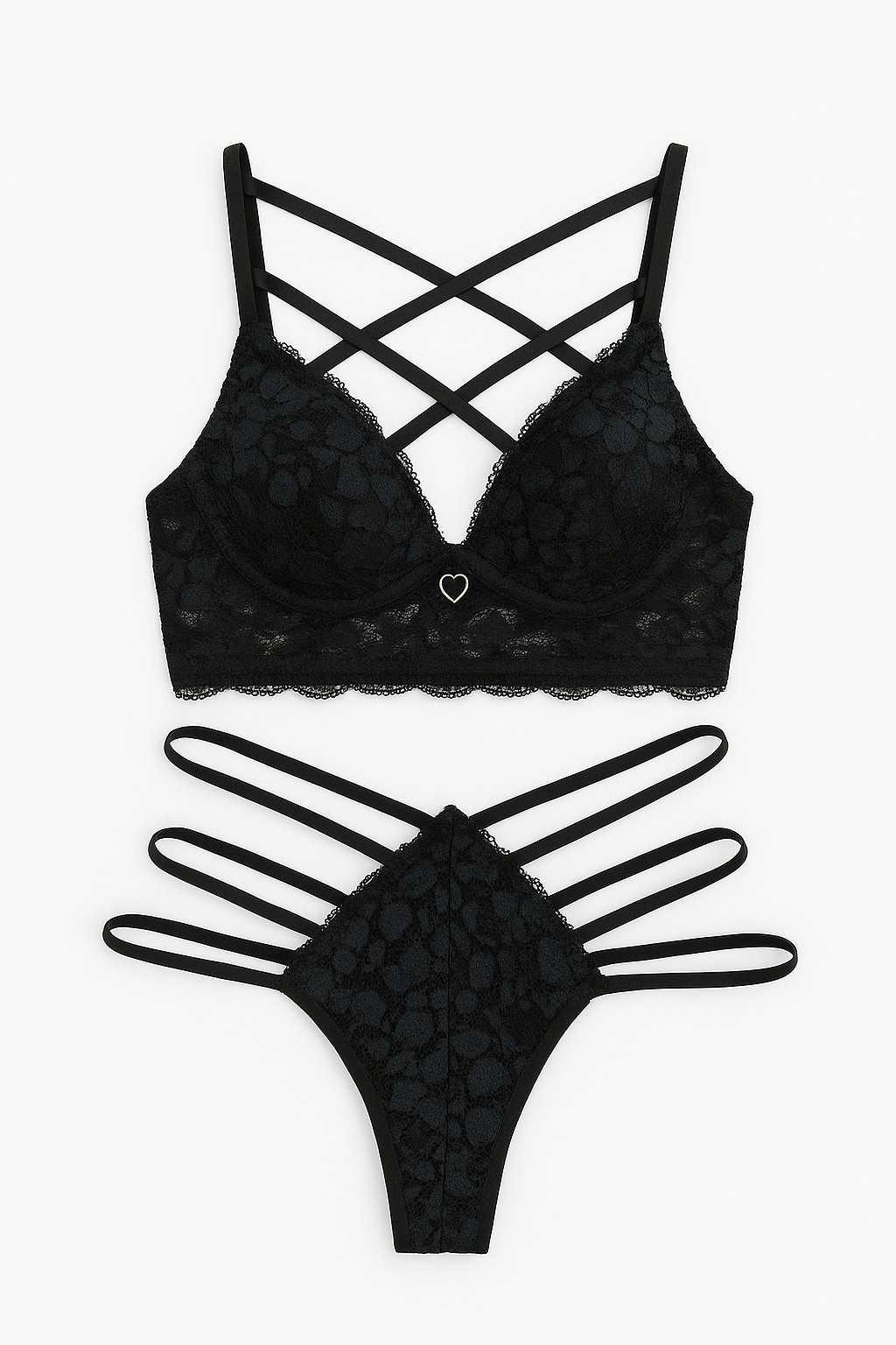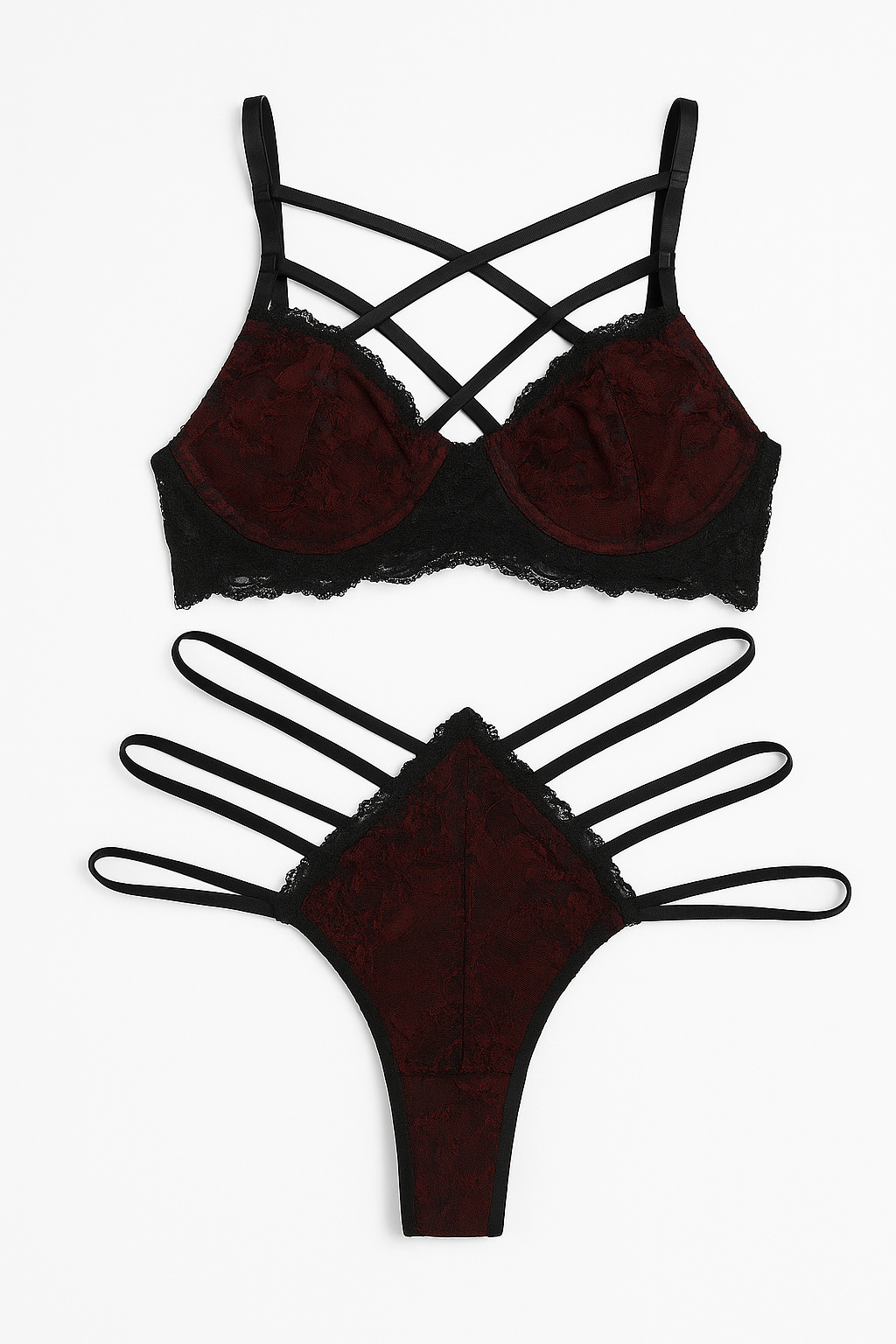 Este conjunto de lencería de encaje en color burdeos con detalles en negro es ideal para quienes buscan combinar sensualidad y comodidad. El sostén presenta un elegante diseño con tiras cruzadas en el escote, que realzan y aportan un toque sofisticado. La parte inferior complementa el look con un encaje delicado y múltiples tiras ajustables que envuelven la cintura, creando una figura estilizada y atractiva. Perfecto para ocasiones especiales o para sentirte segura y atractiva en cualquier momento.