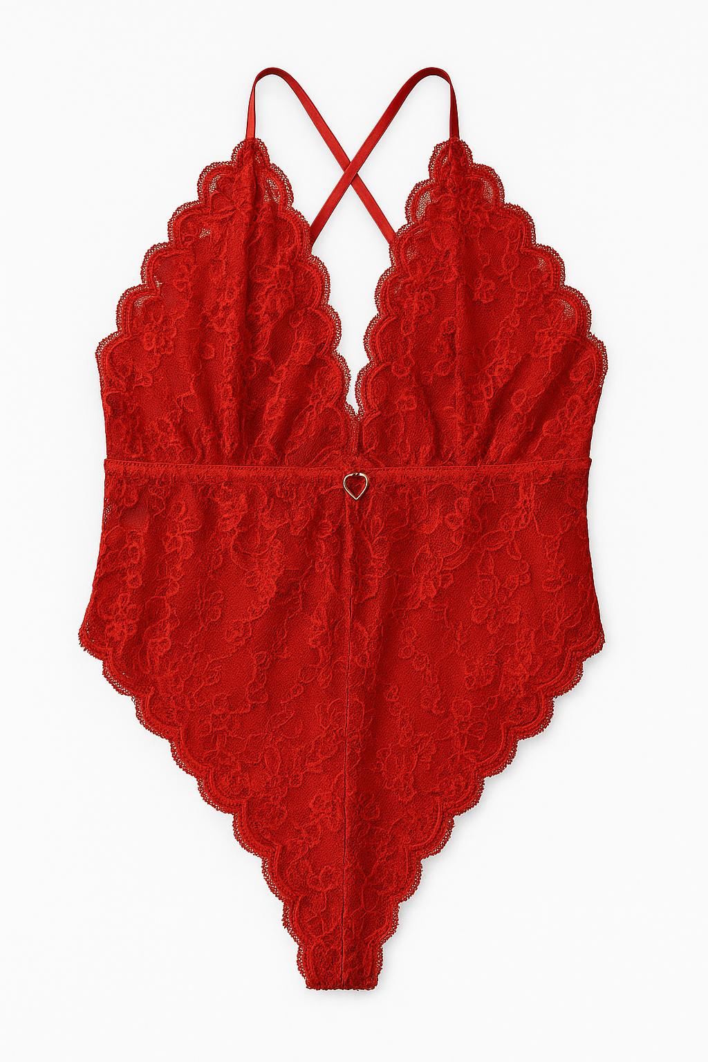 El body es de encaje rojo, con un diseño de patrón floral. Tiene tirantes finos y un escote profundo en V, con detalles semitransparentes en la parte central que realzan el diseño del encaje. La prenda está diseñada para ofrecer comodidad y estilo, resaltando las curvas naturales del cuerpo. El encaje es delicado y se ajusta al torso, mientras que el diseño es de corte alto en las piernas. Ideal para personas con una talla grande que buscan una prenda femenina y sensual.